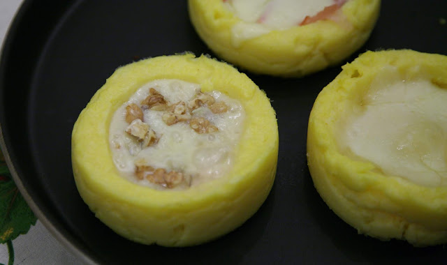 Prendere i muffin di polenta e scavare per creare la forma dei vol au vent, aggiungere un pezzetto di gorgonzola e un pezzetto di noce.