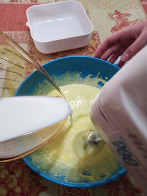 Amalgamate lo zucchero con le uova e create un composto spumoso, ad esso aggiungete il latte un pò alla volta. Montate fino a che gli ingredienti siano ben sciolti.