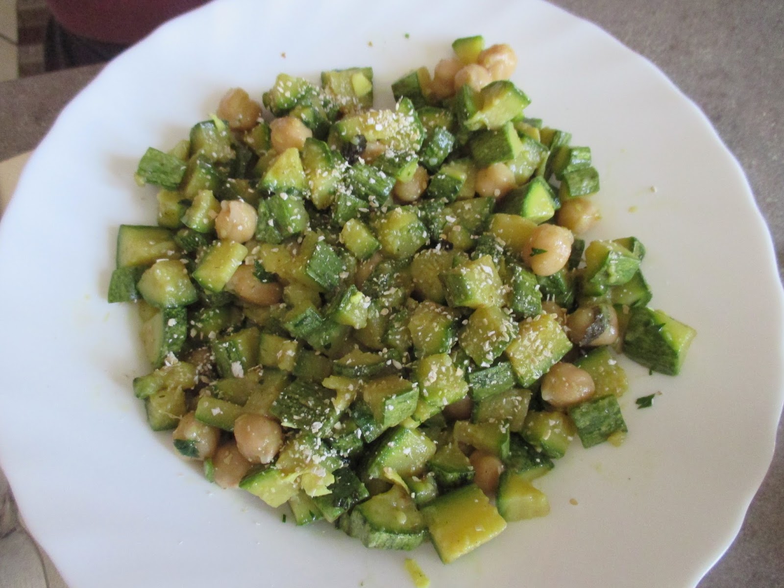 This salad warm time with a legume and a vegetable that in my humble opinion are very good together. Excellent also the sesame seeds and the cheese which gives it a special creaminess caused by the heat of the dish. Perceptions crunchiness (zucchini), creaminess (chickpeas).