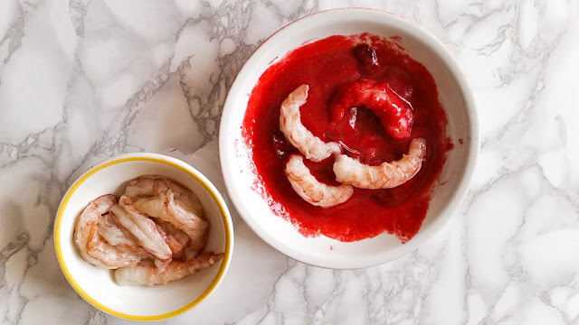 We made a new experience with the raspberries marinade: it seemed to us that the acidity of the raspberries could combine well with the sweetyness of the prawns. We have to say that the flavour was pretty good. If you try this marinade, let us know what do you think about it.