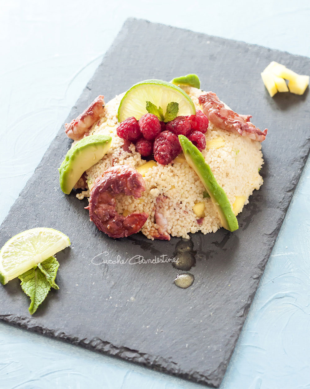 English. Well, you have finally got all of the ingredients you need to assembly the dish. Place the couscous into a large bowl. Add 3/4 of the prawn tails, the diced mango and avocado. Season with the citronette. Combine.