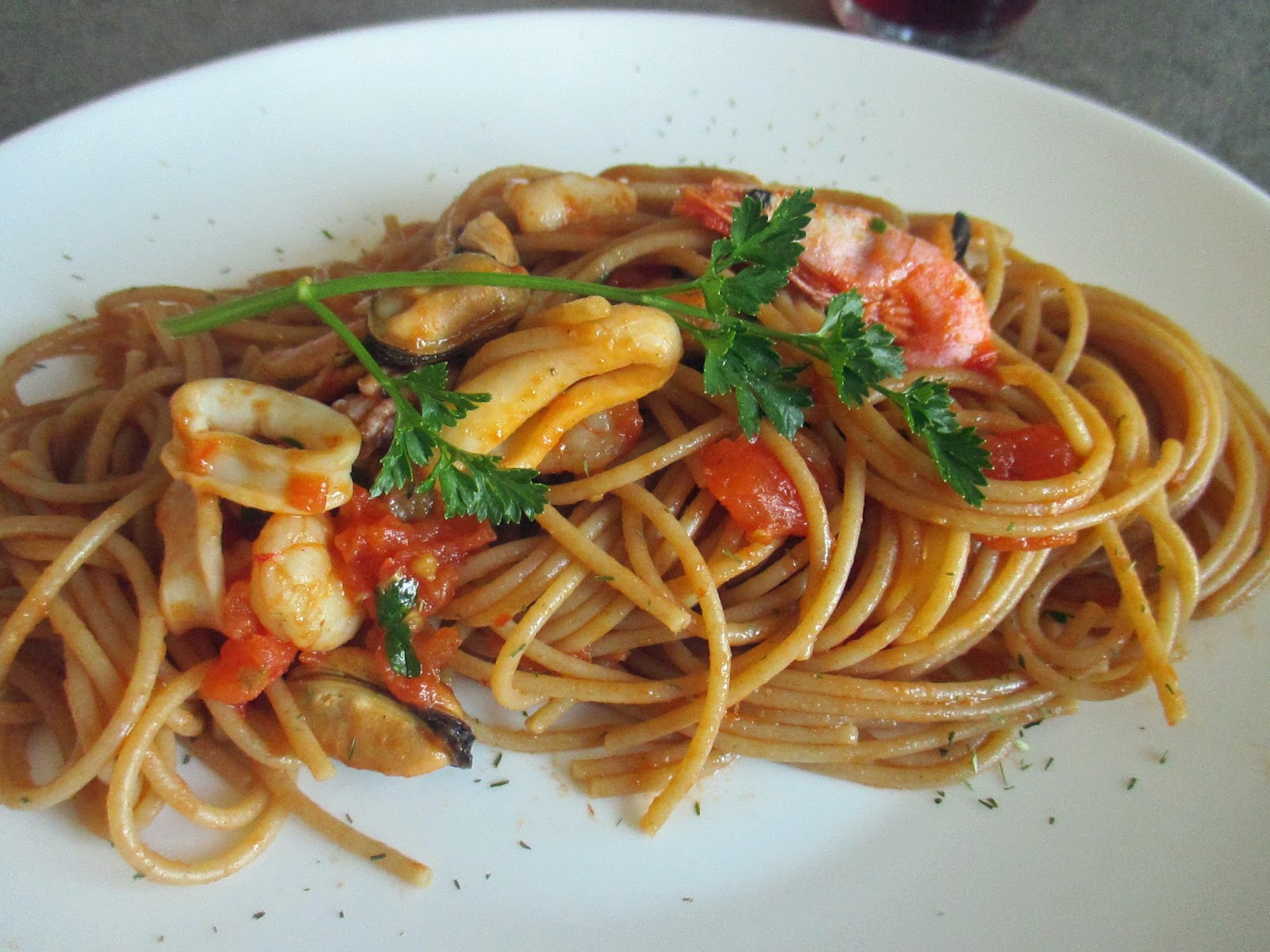 Nettoyer le calmar, couper en rondelles. Laver les crevettes, sec. Couper les tomates en cubes et les faire frire dans l’huile d’olive et l’ail. Ensuite, ajoutez les calmars et aussi et les crevettes et cuire pendant environ 20/25 minutes. Une cuisine de score parfait, ajoutez également les moules et la cannelle, le poivre et le persil. Bien faire cuire et cuire pendant 10 minutes.
