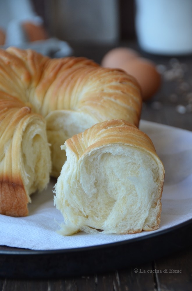 Riprendete le palline, stendetene una alla volta con il mattarello realizzando un ovale, lungo circa 30 cm. A questo punto con l’aiuto di un tarocco o di una rotella taglia pizza, incidete – dalla metà dell’ovale – tante striscette lunghe quindi circa 15 cm. Tenete presente che più sottili le farete e più sarà bello l’effetto in cottura. A questo punto, partendo dalla parte superiore dell’ovale di pasta non inciso, ripiegate pochissimo la pasta laterale verso il centro, quel tanto che arrotolando – in direzione della pasta precedentemente tagliata a pettine – sia possibile ottenere un rotolino perfetto con tutte la “frangia” sulla parte esterna. E’ più semplice da fare che da spiegare, comunque qui trovate il video, se volete vedere i passaggi più chiaramente. Disponete i rotolini ottenuti nella teglia, uno accanto all’altro in modo circolare. Coprite con della plastica per alimenti e lasciate lievitare per circa 1 ora o finché non saranno raddoppiati. Spennellate la brioche con un poco di latte e cuocetela nel forno caldo areato a 170°C per circa 20/25 minuti. Appena sfornata spennellate la vostra brioche o con del latte (come ho fatto io) o come Fedora con uno sciroppo fatto con 25 gr di zucchero sciolto in 25 ml di acqua. Lasciate la brioche nello stampo per 10/15 minuti, poi sformate e ponetela a raffreddare completamente su una gratella per dolci. Io l’ho conservata sotto la campana di vetro per dolci ed il giorno dopo era ottima, il giorno successivo ho preferito passarla qualche minuto in forno. Nel caso anche voi voleste scaldarla per farle riprendere fragranza, vi consiglio di incartarla con della carta di alluminio per alimenti, così che il calore del forno non pregiudichi la sua sofficità. Buon appetito!