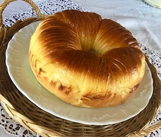 Prima di infornare spennellate la superficie del Pan Brioche con un uovo sbattuto, poi cuocete a 180° per 20 minuti circa. Mentre cuoce preparate lo sciroppo di acqua e zucchero e una volta sfornato il Pan Brioche utilizzatelo per spennellarlo.