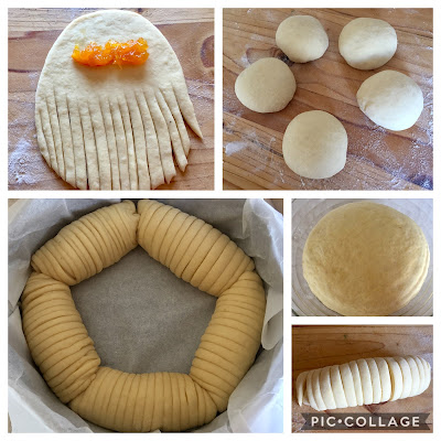 Setacciate la farina e mettetela nella planetaria, al centro versate il lievito sbriciolato e scioglietelo con un poco di latte tiepido. Una volta sciolto il lievito iniziate a impastare con il gancio aggiungendo prima il resto del latte e poi la panna, l’uovo, lo zucchero e infine il pizzico di sale. Impastate fino ad ottenere un impasto liscio, incordato, che si stacca dalle pareti della planetaria. Versate l’impasto sulla spianatoia infarinata, arrotondatelo e fatelo lievitare in un luogo caldo fino al raddoppio. Quando sarà lievitato dividete l’impasto in 5 parti uguali formando delle palline che farete riposare per almeno 15 minuti. Preparate intanto la tortiera rivestendola con la carta forno. Stendete poi ogni pallina in un ovale e con un tagliapasta o un tarocco tagliate a striscioline la parte superiore, nella parte bassa mettete un cucchiaino di marmellata. Arrotolate partendo dal lato farcito e chiudendo i lembi esterni. La parte tagliata deve rimanere in alto. Disponete i rotolini a raggiera nella tortiera e fate lievitare fino al raddoppio in un luogo caldo.
