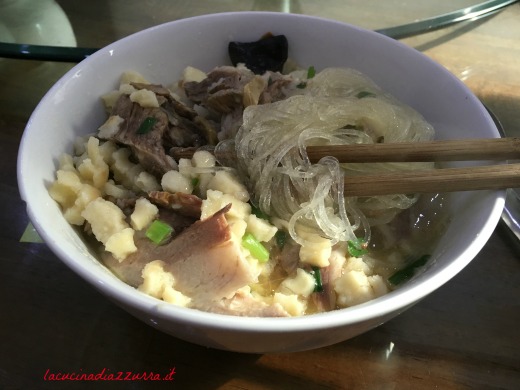 Non potevo andare in Cina senza sperimentare la cucina cinese, anche se gli street food non li ho quasi per niente assaggiati, viste le situazioni igieniche in cui lavorano ho preferito evitare, ma a Xi’An Marco, il nostro referente, c’ha portati in un ristorante dove abbiamo mangiato una zuppa, un piatto unico, di brodo, carne, spaghetti di riso e mollica di pane, divina, da perderci la testa, speziata, appena piccante con quel sapore di coriandolo che adoro!!!