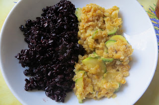 150 gr lenticchie rosse decorticate, 2 zucchine, cipolla, curry, olio extravergine d’oliva, sale integrale, 140 gr riso integrale venere.