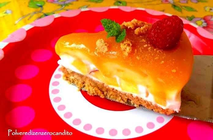 A questo punto è possibile preparare la copertura di pesche che sono da lavare, sbucciare e tagliare a pezzi, quindi frullarle… aggiungere la gelatina già ammollata e strizzata, proprio come abbiamo fatto prima, scaldare il tutto sul fuoco, in modo che si sciolga per bene e far raffreddare.