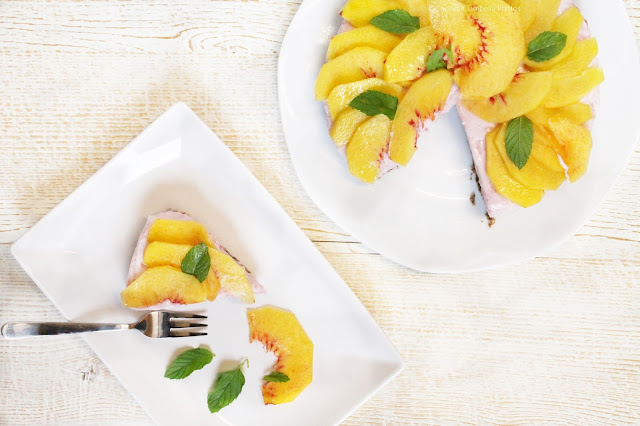 Creare la base triturando nel mixer i fiocchi di avena con i biscotti e il burro fuso e disporla sul fondo pigiando bene con il dorso di un cucchiaio. Io per sicurezza ho ricoperto tutta la tortiera con della pellicola per alimenti. A parte creare la crema con lo yogurt, la ricotta setacciata, il miele e i lamponi omogeneizzando ben bene. Unire la gelatina al composto di yogurt (seguite le istruzioni sulla confezione). Versare la crema nello stampo e porre in frigorifero per almeno 12 ore. Trascorso il tempo di riposo, sformare il dolce e decorare con fette di pesca nettarina. La mia gelatina, non ha gelificato molto, come potete vedere dalla foto il taglio non è perfetta!!! :-(