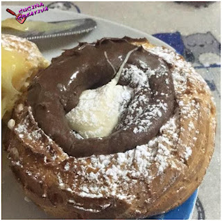 INGREDIENTI: 250 ml di acqua 60 gr burro panna montata 125 gr farina 3 uova; Sale; Crema pasticcera: 125 ml di latte; 1 tuorlo; 15 di maizena; 20 g di zucchero; 2 tocchetti di cioccolata fondente grandi; Scaldare l’acqua con il burro e un pizzico di sale. Appena raggiunge il bollore aggiungere la farina setacciata tutta insieme. Formare una palla, e togliere dal fuoco quando inizia a sfrigolare. Lavorarla un pò con le mani sul piano di marmo, fino a far sciogliere eventuali grumi di farina rimasti. Aggiungere le uova una alla volta. Formare una crema e utilizzare la siringa da pasticcere per formare le ciambelle con due giri uno sull’altro. Cuocere a 180° – 200° per 20 minuti. Fare la crema pasticcera, semplice o come me al cioccolato: fate scaldare il latte con i tocchetti di cioccolato che si devono sciogliere. Intanto sbattete il tuorlo con lo zucchero e unite poi la farina. Unitevi il latte e riportate tutto sul fuoco fino a far formare la crema. Mettete la crema nei bignè, al centro un ciuffetto di panna montata., spolverizzate con lo zucchero a velo e servite!