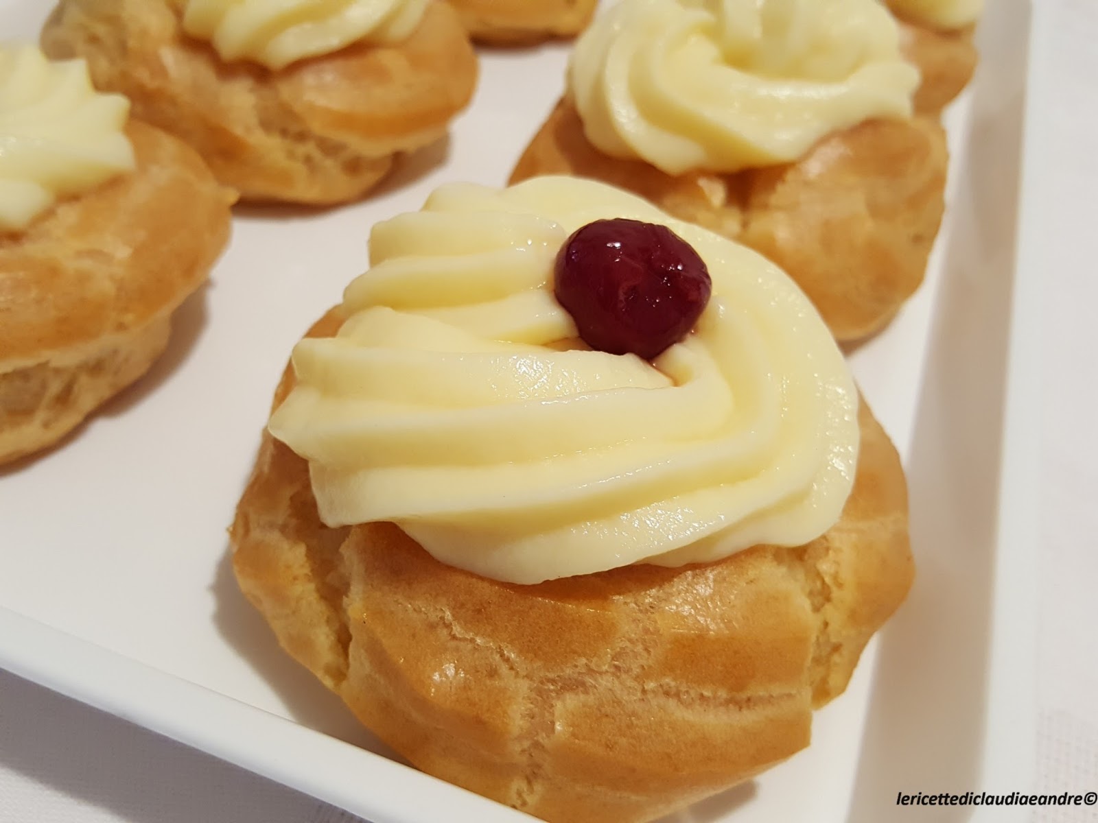 - Una volta cotte e raffreddate le zeppole mettere la crema pasticcera in una sac a poche con la bocchetta grande a stella e decorare.