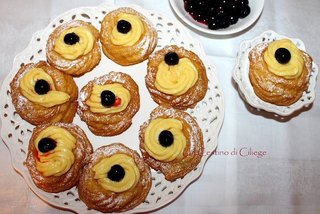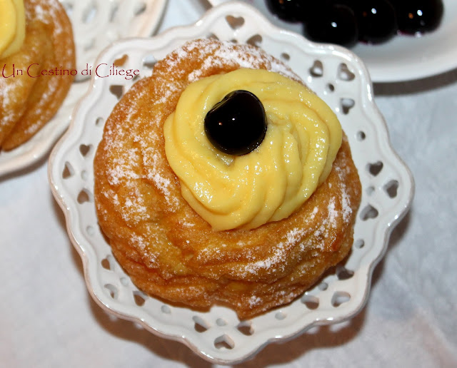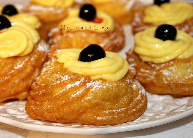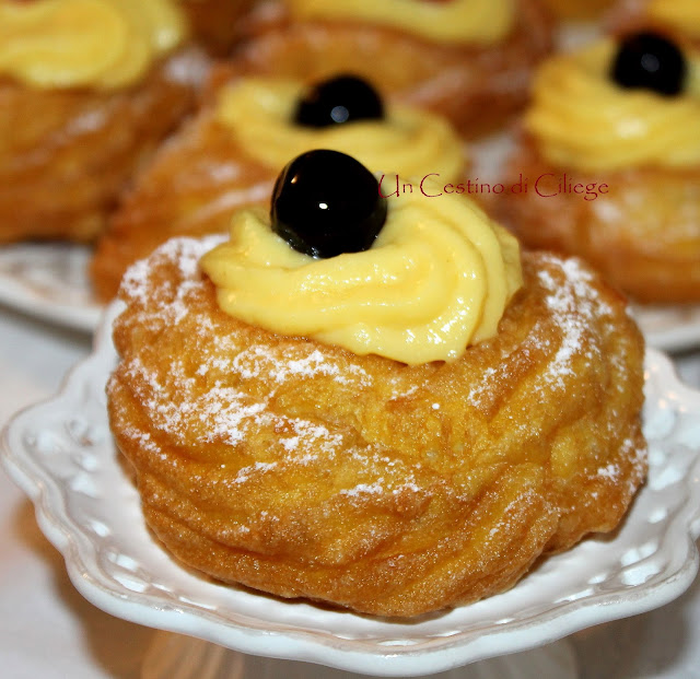 Mettetela in una sac à poche con bocchetta a stella, prendete le zeppole spolverizzatele con zucchero a velo, farcitele e decoratele con crema e amarene sciroppate.