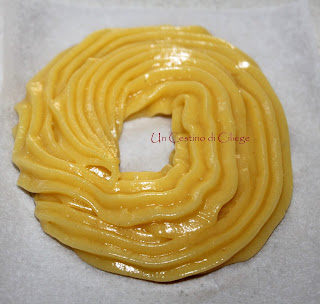 Formate sopra i quadrati di carta forno le zeppole di circa 6 cm di diametro con due giri di impasto uno sopra l’altro, come nella foto.