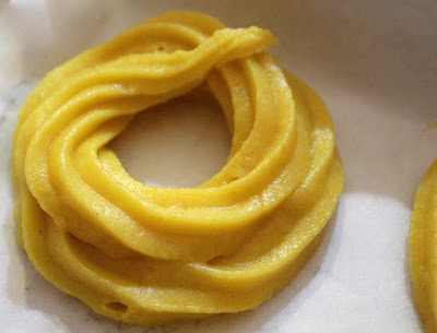 Rivestire la lastra del forno con l’apposita carta e formare le zeppole: fare un primo cerchio con diametro di circa cinque centimetri e sovrapporre un secondo giro lievemente più piccolo (servirà per “chiudere “le zeppole e trattenere la crema pasticcera).