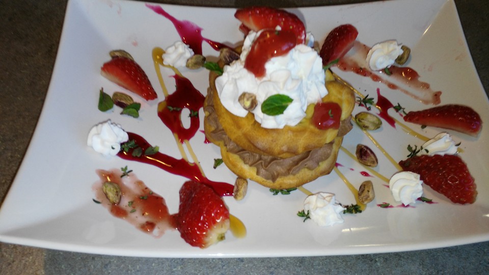 Take now the pate a choux cooked and put a layer of cream on a chocolate disk. Superimpose another disc, and then into the hole, add the raspberry jam, a little freshly grated ginger and a few chopped pistachios. Complete with chantilly cream and garnish with strawberries, mint and fresh thyme.