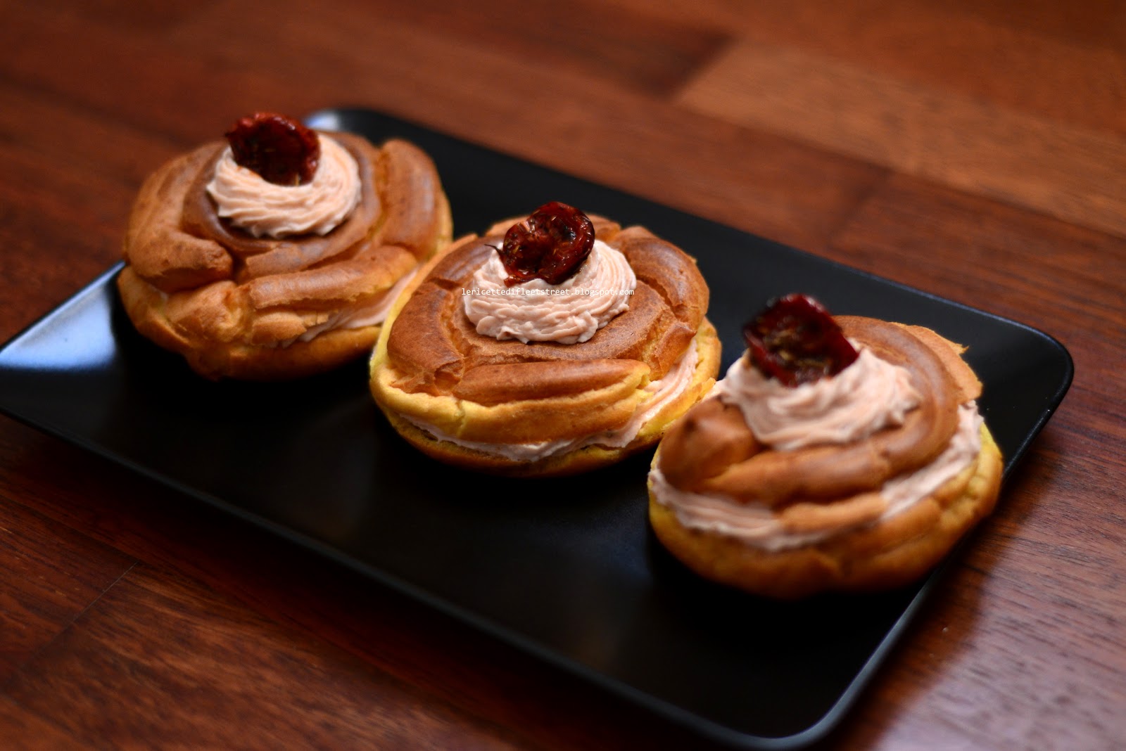 Per festeggiare il papà, senza dettagliarne gli acciacchi, zeppole di San Giuseppe al forno con crema di salmone e pomodorini arrosto.