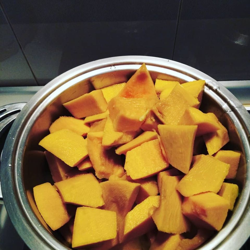 Tagliate e lavate la zucca a dadini e fatela rosolare con olio, uno spicchio di aglio, una manciata di cipolla.