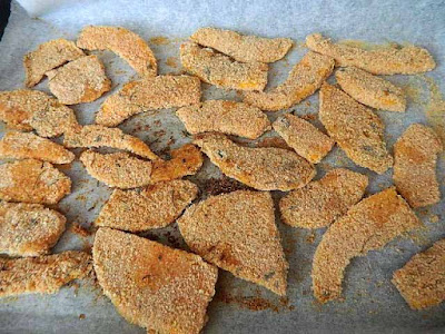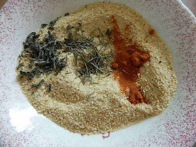 Sbattere le uova con un pizzico di sale in un piatto e mescolare in un altro piatto il pangrattato, il peperoncino e le erbe.