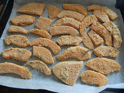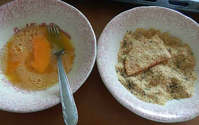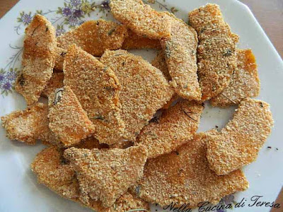 Passare le fette di zucca prima nelle uova poi nel pangrattato alle erbe premendo bene,