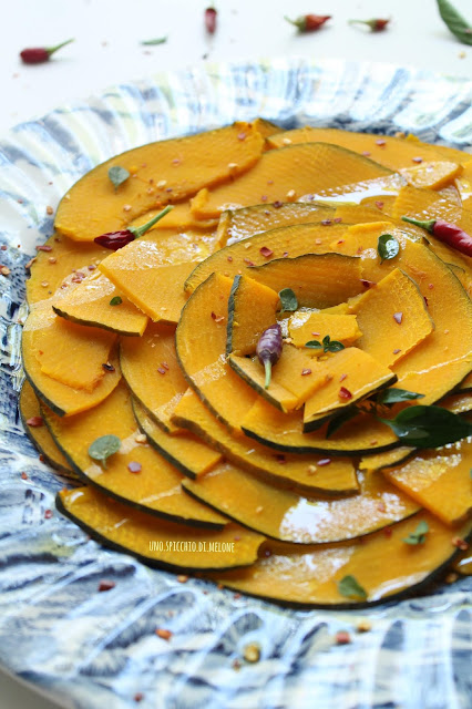 Distendete le fette di zucca su un bel piatto e condite con OLIO e PEPERONCINO.