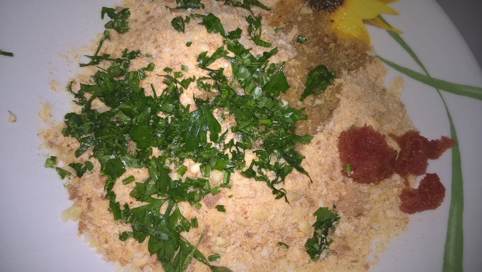 Prendere del pane grattugiato, unirvi del prezzemolo tritato, uno spicchio d’aglio tritato finemente, sale, pepe, olio extravergine d’oliva, un cucchiaino di concentrato di pomodoro e due cucchiaiate di caciocavallo grattugiato.