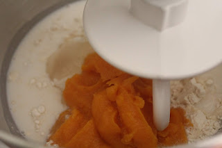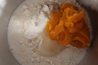 Versare nella ciotola della planetaria versare la farina, il latte con il lievito e la polpa di zucca.