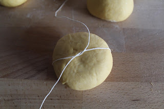 far passare il laccetto ad un terzo del panetto, e ripetere ancora una volta in modo da ottenere un panetto