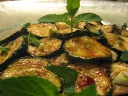 Ingredienti per 4 persone: 500 g zucchine, 2 spicchi aglio, ½ tazzina aceto, 3-4 foglie di menta, sale, 5-6 cucchiai di olio oliva.