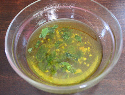 Nel frattempo preparare la “scapece”: versare in una ciotola l’olio, l’aceto, lo spicchio d’aglio tritato, le foglie di menta spezzettate, il pepe, il sale e mescolare per distribuire gli aromi.
