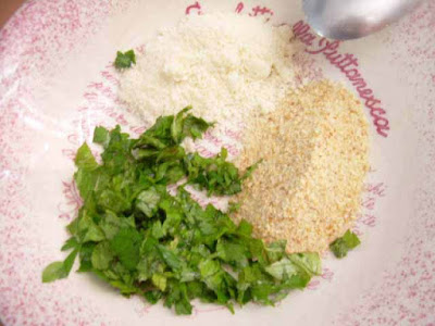 In un piatto mescolare il pecorino, il pangrattato e le erbe aromatiche sminuzzate.