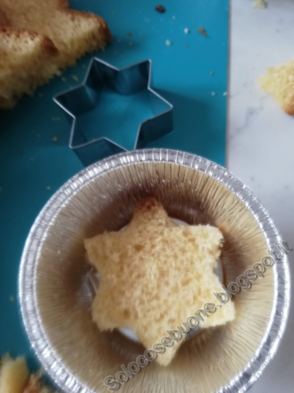 Uniamo ai tuorli il mascarpone poi la panna ed infine dal basso verso l’alto gli albumi. Tagliamo a fette il pandoro e ritagliamo con l’aiuto di formine delle stelle.