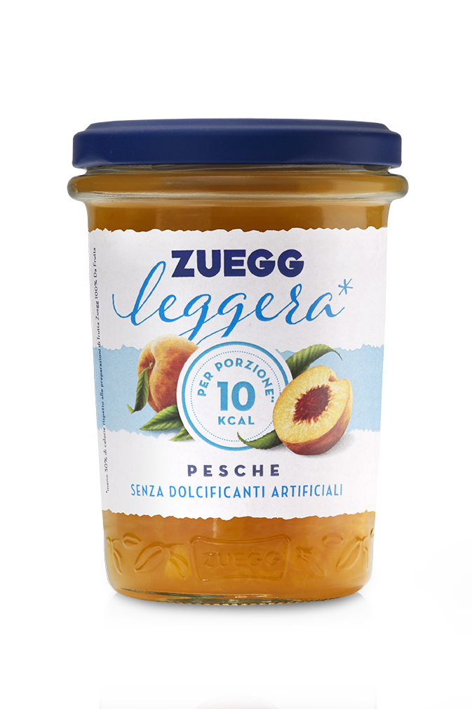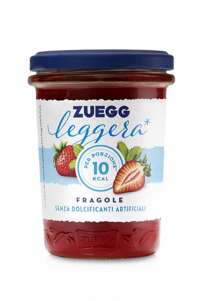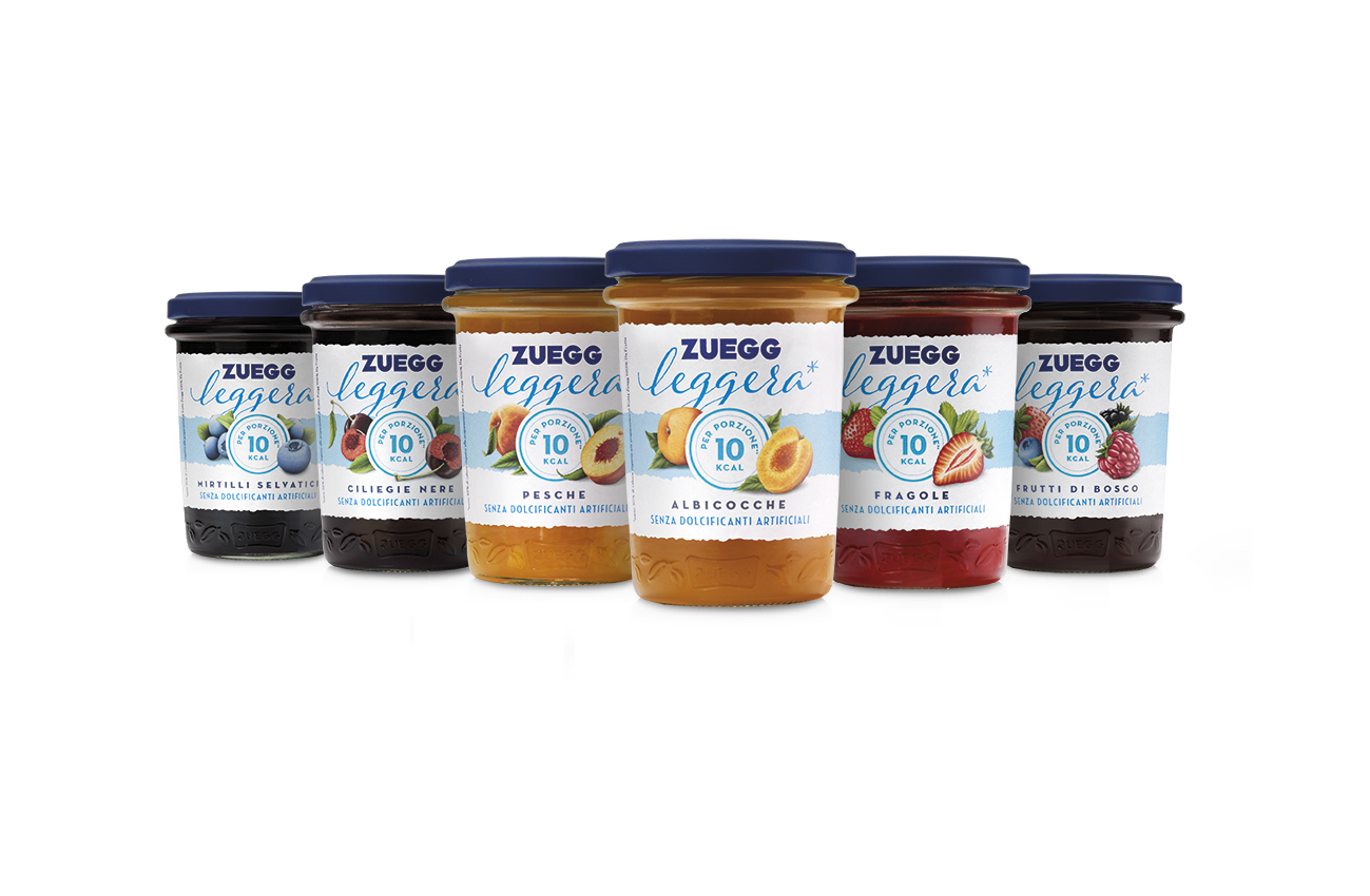 L’etichetta bianca e la scelta stilistica della parola “leggera” fanno risaltare anche graficamente l’essenza stessa del prodotto e ne sono l’elemento distintivo. La naturalità della referenza è immediatamente percepibile dal colore naturale della frutta nel vasetto di vetro trasparente, impreziosito dal lettering Zuegg e dalle foglioline distintive sul fondo.