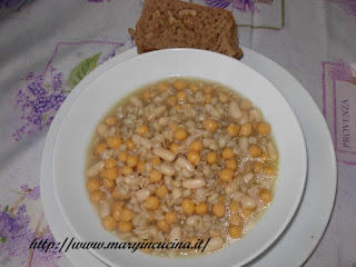 Tenere in ammollo tutta la notte fagioli ceci ed orzo. Eliminare l’acqua di ammollo e far cuocere per 1 ora e 20 minuti i ceci ed i fagioli in una pentola di terracotta coperti d’acqua. Aggiungere l’orzo e proseguire la cottura per altri 40 minuti. A fine cottura aggiungere sale, pepe, un filo d’olio e portare in tavola.
