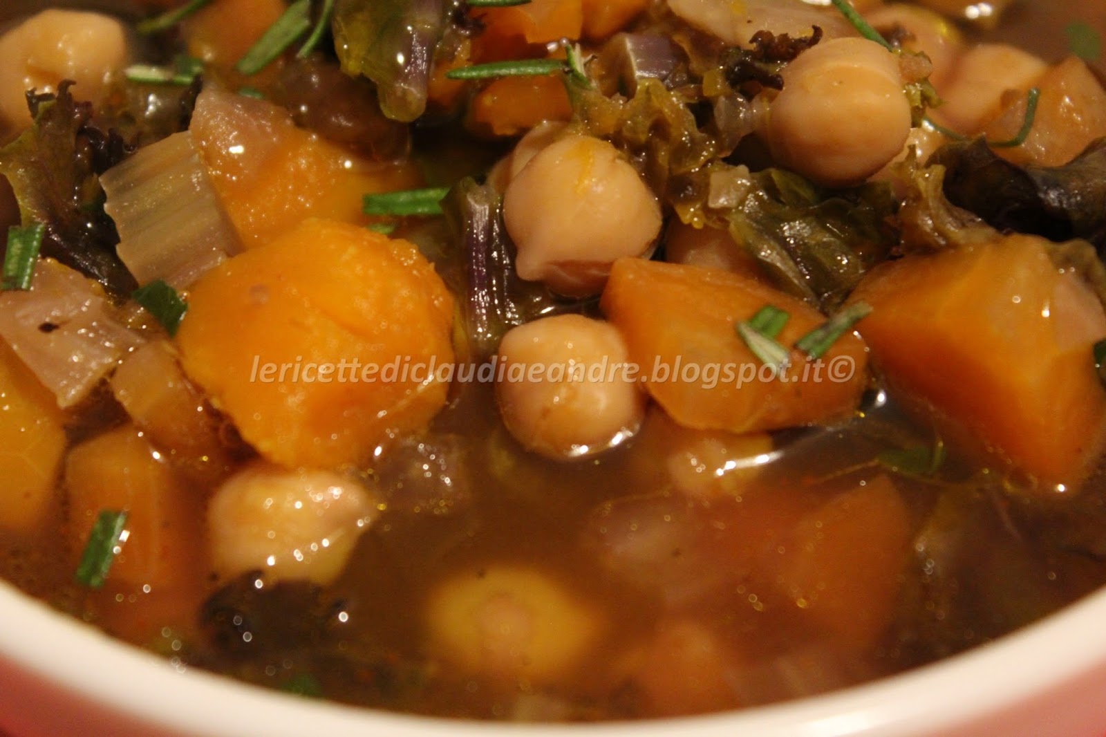 In un tegame capiente fare un soffritto con la cipolla, il sedano, le carote, il peperoncino tagliato a rondelle, in qualche cucchiaio di olio per circa 2 minuti. Aggiungere il cavolo riccio viola, insaporire per un minuto, unire anche la zucca e coprire con acqua bollente due dita sopra tutta la verdura, insaporendo con brodo granulare vegetale, con pepe e cuocere a fuoco moderato per circa 30 minuti. A questo punto aggiungere anche i ceci, uno o due rametti di rosmarino, coprire con acqua bollente un dito sopra le verdure e proseguire la cottura per altri 10 minuti, insaporendo se necessario con altro brodo granulare vegetale o in mancanza con del sale o il brodo che usate abitualmente. (se non avete del peperoncino fresco, usate pure quello in polvere) . Servire calda !