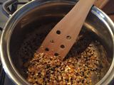 Rosolate in olio evo lo scalogno tritato finemente. Unite la zucca e il rosmarino tritato fine (foto 1). Aggiungete la Zuppa del Bosco facendola tostare per alcuni minuti (foto 2). Versate nella padella il brodo vegetale e proseguite la cottura per circa 25 minuti. Nel frattempo tagliate a brunoise (cubetti piccoli) sia la zucca che i funghi porcini. Arrostiteli in olio evo, unendo anche del rosmarino tritato (foto 3). Nella spessa padella arrostite il pane tagliato a fette sottili.