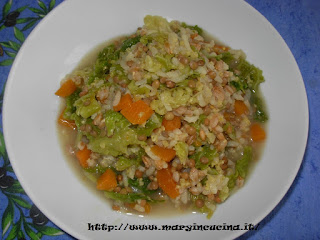 200 gr cereali misti (farro, riso, miglio), 60 gr lenticchie, 1 fetta di zucca, qualche foglia di verza, sale integrale, curry, 1 scalogno.