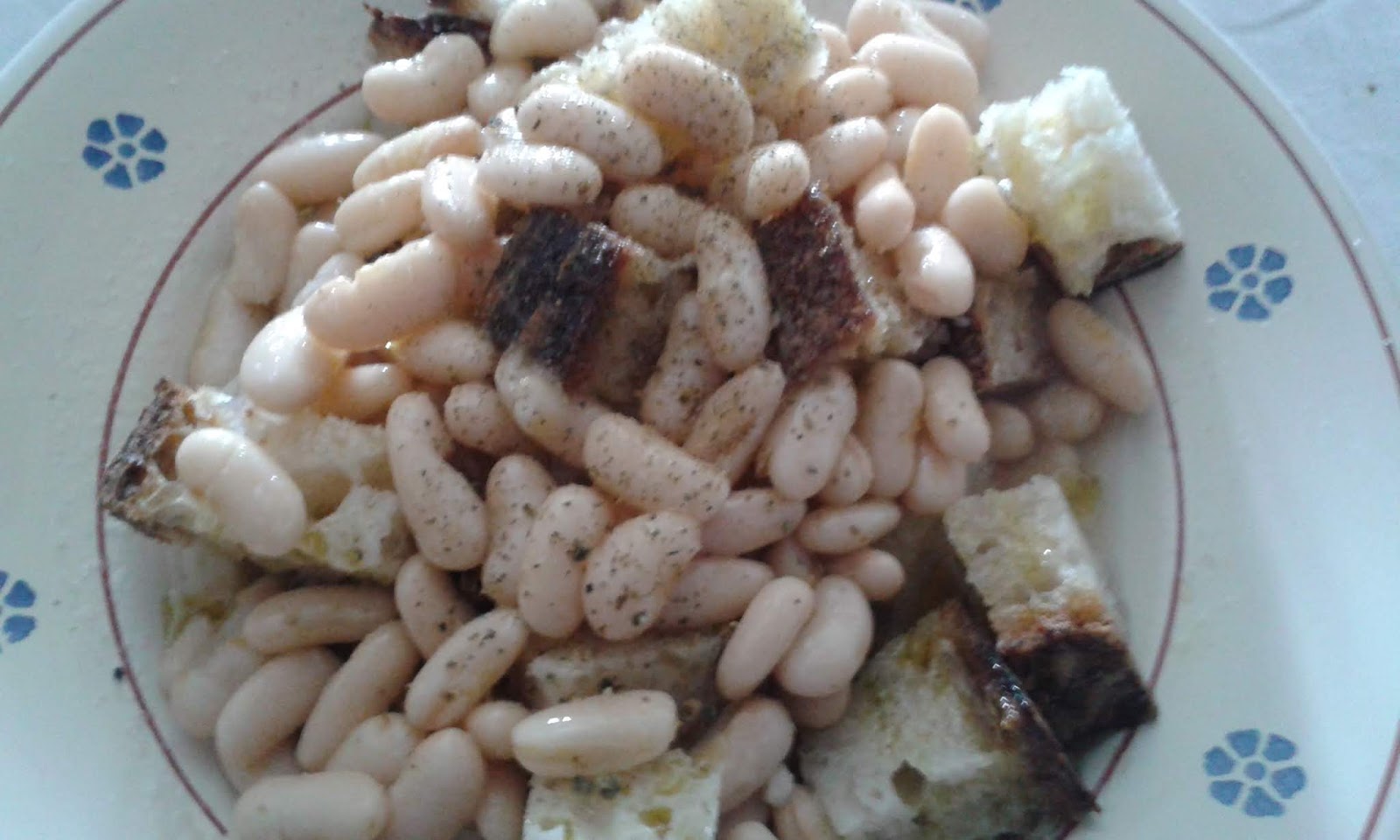 In un piatto fondo, pane a tocchetti,cipollina e a bagnare ,mestoli di acqua e fagioli