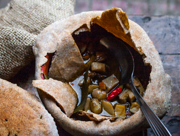 Distribuite la zuppa nelle scodelle, unite i quattro peperoncini, coprite ogni scodella con un disco sigillandolo bene ai bordi e infornate per una ventina di minuti a 200 gradi.