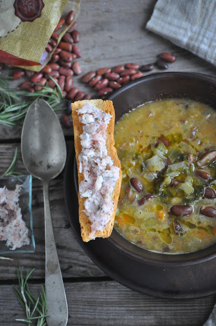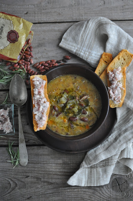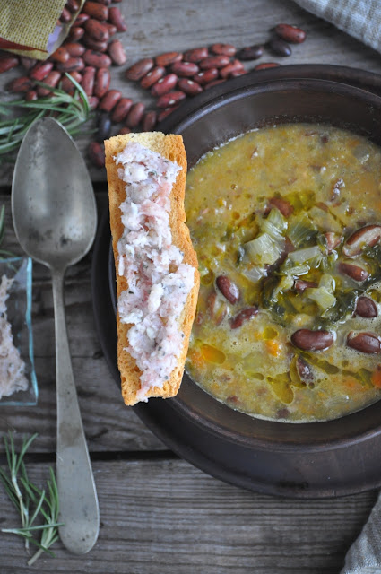 A differenza di tanti, amo le giornate fredde e piovose. Forse la tristezza interiore che mi accompagna da sempre, si riflette anche in questo, oltre che nella scelta dei colori, nel mio stile e nella sfumatura dei miei capelli. Riscopro in queste giorni il piacere di vivere la mia casa. Il gusto e quella lentezza che in altri momenti è impossibile solo pensare. La guardo con occhi diversi. Osservo ogni sua piccola sfumatura e mi fermo a ricordare dove e quando è stato acquistato quel complemento d’arredo che è nel posto giusto e in armonioso equilibrio con tutto il resto. Vista la pioggia e le fredde temperature di questo giorno di festa, ho deciso di riscaldare gli animi e lo stomaco con una zuppa di fagioli, ed il ricordo a momenti della mia infanzia è riaffiorato in un attimo. Quel borbottio e quel “profumo antico” hanno piacevolmente accompagnato la mia mattinata. Non c’è nulla di più consolatorio e gustoso di un piatto caldo e fumante, reso oggi ancor più ricco, perché servito con caldi crostini di pane Toscano con un goloso pesto di lardo di Colonnata e rosmarino…