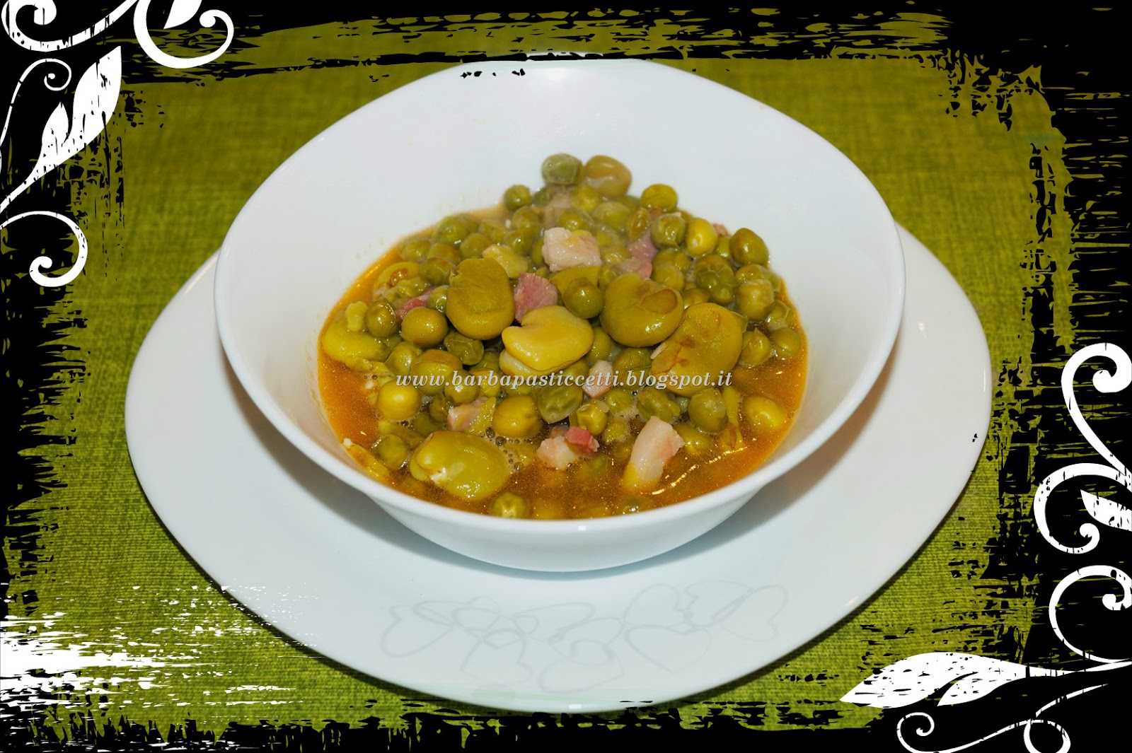 In un tegame largo versare olio evo sul fondo quindi rosolare il porro tagliato sottilmente, aggiungervi poco dopo il guanciale tagliato a dadini, i piselli e le fave ed il concentrato di pomodoro.