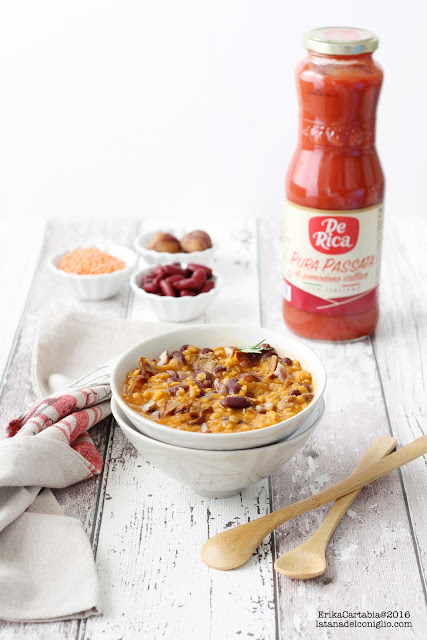 Questa è una ricetta che amo e che realizzo spesso per la mia famiglia. Ci sono tutti gli ingredienti che amo di più, soprattutto da quando ho scoperto l’esistenza delle lenticchie rosse. Pronte in pochissimi minuti, non necessitano di ammollo e regalano un sapore ed una consistenza unica in ogni zuppa. E poi c’è sempre un tocco di passata di pomodoro vallivo DeRica, un trucchetto a cui difficilmente rinuncio. Riesce a regalare un colore e un profumo unico ad ogni zuppa esaltando i sapori dei legumi. Lo scoprirete sin dai primi minuti, quando il soffritto insaporire i legumi e la passata inizia lentamente a cuocere! Una delizia!
