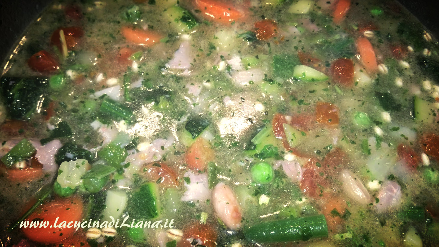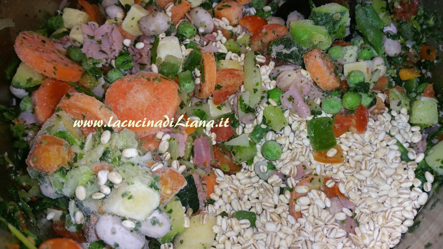 Rosolare nell’olio il prosciutto e le verdure, aggiungere l’orzo, le ecodosi (4) di brodo vegetale, chiudere il coperchio della pentola a pressione e impostare 15 minuti a livello 1 di pressione. A fine cottura condire con il parmigiano.
