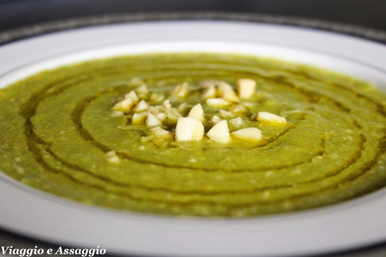 In a pan with little oil fry garlic clove. Remove it and add chopped onion and carrot, then add green beans. Cook for about 2 minutes, add about a cup and a half of water. Add salt and cook covered for about 15 minutes. Blend everything with a mixer,add salt if necessary and complete dish with some chopped almonds and a drizzle of extra virgin olive oil.