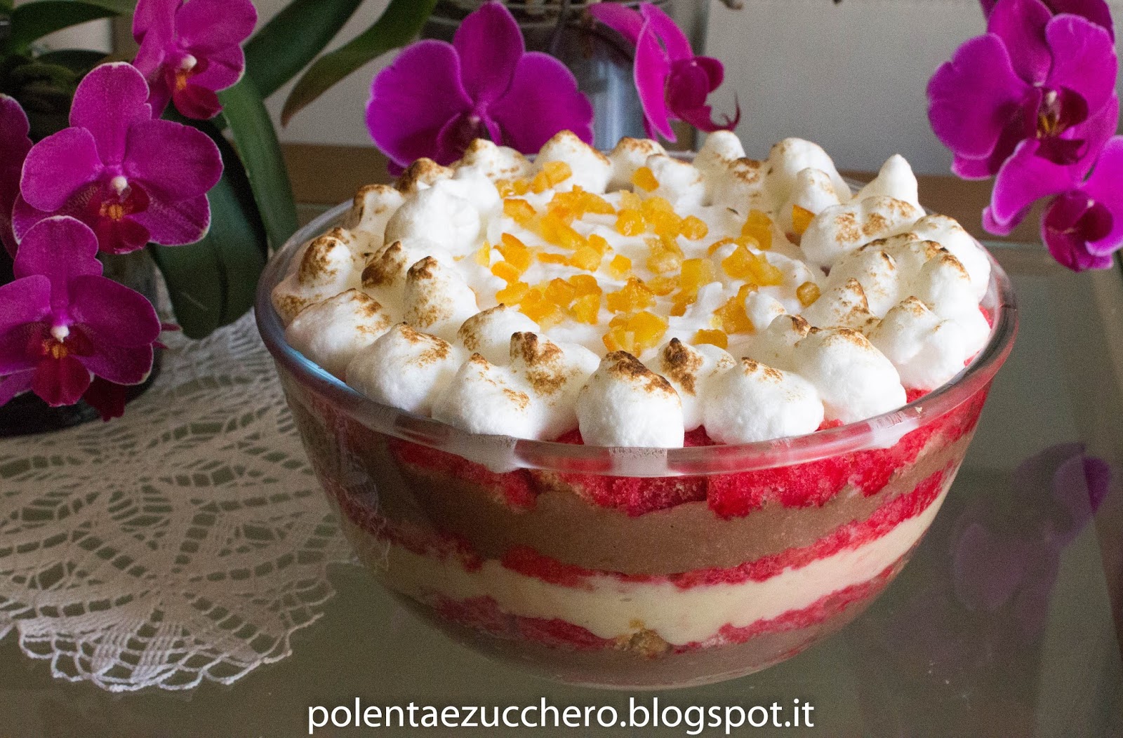 Per comporre la “zuppa” iniziare tagliando il Pan di Spagna a fette e possibilmente non superiori al cm. In una grande coppa o nel recipiente scelto fare un primo strato di crema pasticciera, ricoprirlo con le fette di Pan di Spagna inzuppandole bene con la bagna preparata, fare un secondo strato con la crema al cioccolato e di nuovo ricoprirlo con le fette di Pan di Spagna inumidendole con la bagna. Proseguire così fino ad avere due strati di crema pasticciera e due strati di crema al cioccolato e terminare con il Pan di Spagna. Ricoprire il tutto con la meringa italiana distribuendola a piacere e riporre il dolce in frigo per alcune ore. Prima di servire decorare a piacere con qualche pezzetto di arancia candita e flambare la meringa.