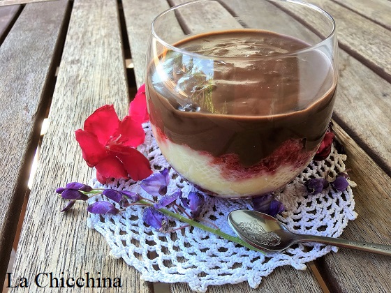 Ora componiamo i bicchieri iniziando con la crema al cioccolato, poi con fette di pan di spagna imbevuto nell’Archermes allungato con un pochino d’acqua, poi crema pasticcera gialla, altro pan di spagna e così via fino ad esaurimento degli ingredienti. A piacere si può terminare con scaglie di cioccolato fondente. Far riposare in frigo almeno due ore prima di consumare