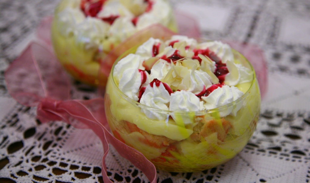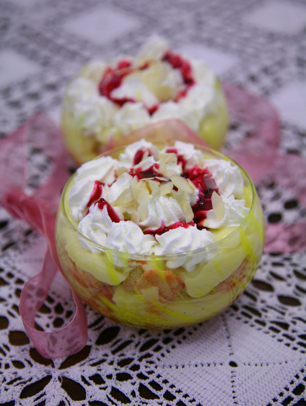 Prendere le ciotoline e fare uno strato con i savoiardi imbevuti di bagna all’Alchermes. Realizzare uno strato con la crema pasticcera, aggiungere le mandorle, un altro strato di savoiardi imbevuti, uno di crema pasticcera e uno di panna montata.