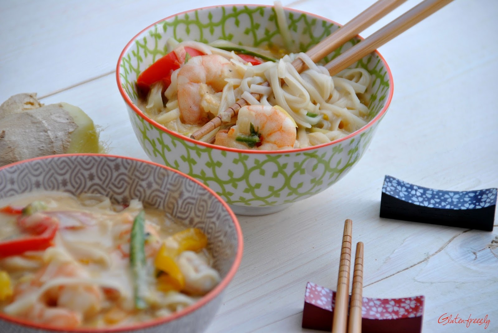 Aggiungete i gamberi alle verdure con il latte di cocco, mescolate pochi minuti ed infine aggiungete le tagliatelle di riso già cotte. Mescolate molto bene e servite in ciotoline.