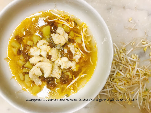 Zuppetta di rombo con patate, lenticchie e germogli di soja
