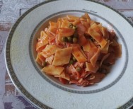 Maltagliati con piselli e bacon al pomodoro